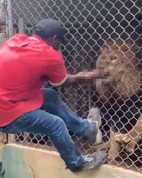 동물원 우리 안에 있는 사자에게 장난을 치다가 봉변을 당한 자메이카 사육사의 영상이 공개됐습니다.