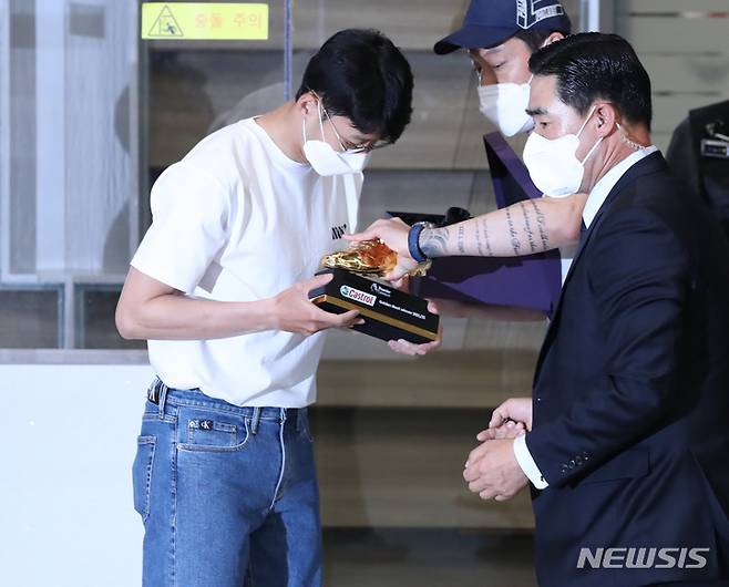 [인천공항=뉴시스] 김진아 기자 = 아시아 선수 최초로 잉글랜드 프로축구 프리미어리그(EPL) 득점왕에 오른 손흥민(토트넘)이 24일 오후 인천국제공항을 통해 귀국, 관계자에게 골든부트를 건네받고 있다. 2022.05.24. bluesoda@newsis.com