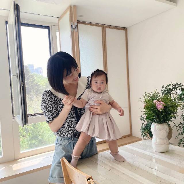 사진 속 한지혜의 딸은 집 거실에서 쌀과자를 먹는 모습.