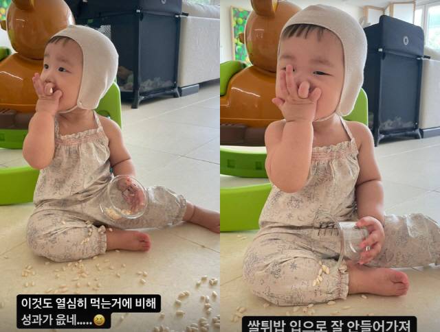 사진 속 한지혜의 딸은 집 거실에서 쌀과자를 먹는 모습. 하지만 입에 들어가는 것 보다 바닥에 흘리는 것이 더 많았고, 엄마 한지혜는 안타까워했다.