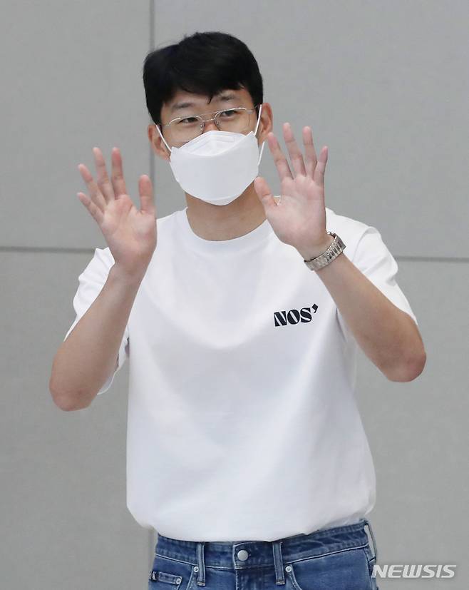 [인천공항=뉴시스] 김진아 기자 = 아시아 선수 최초로 잉글랜드 프로축구 프리미어리그(EPL) 득점왕에 오른 손흥민(토트넘)이 24일 오후 인천국제공항을 통해 귀국, 인사를 하고 있다. 2022.05.24. bluesoda@newsis.com