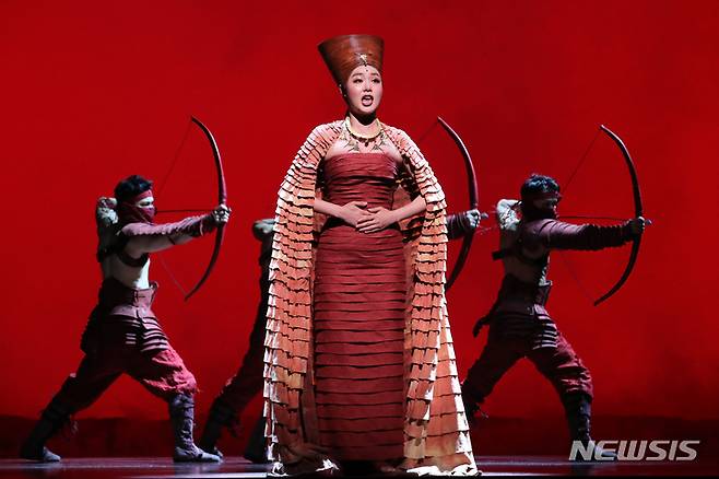 [서울=뉴시스] 박진희 기자 = 뮤지컬 '아이다' 출연 배우들이 24일 서울 용산구 블루스퀘어홀 신한카드홀에서 프레스콜을 하고 있다. 2022.05.24. pak7130@newsis.com