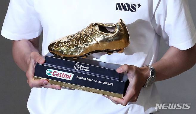 [인천공항=뉴시스] 김진아 기자 = 아시아 선수 최초로 잉글랜드 프로축구 프리미어리그(EPL) 득점왕에 오른 손흥민(토트넘)이 24일 오후 인천국제공항을 통해 귀국, 골든부츠를 들고 포즈를 취하고 있다. 2022.05.24. bluesoda@newsis.com