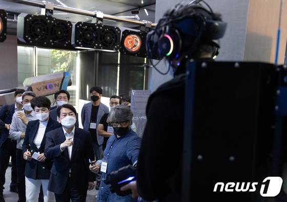 (성남=뉴스1) 이재명 기자 = 안철수 국민의힘 성남 분당갑 후보가 24일 오후 경기도 성남시 분당구 판교이노밸리클러스터에서 열린 초격차 문화콘텐츠 산업을 위한 기업 간담회에서 기업 관계자와 대화하고 있다. 왼쪽은 김은혜 경기도지사 후보. 2022.5.24/뉴스1