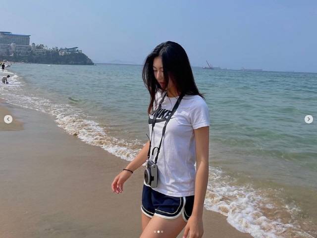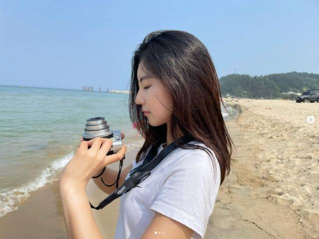 공개된 사진 속 송지아는 해변에서 즉석카메라를 들고 포즈를 취하고 있다.