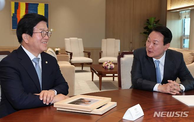 [서울=뉴시스] 전신 기자 = 윤석열 대통령이 24일 서울 용산 대통령실 청사 집무실에서 박병석 국회의장 등 국회의장단과 접견하고 있다. (대통령실통신사진기자단) 2022.05.24. photo1006@newsis.com