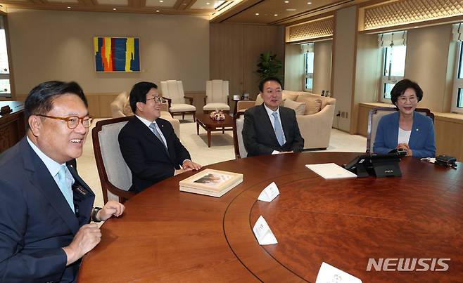 [서울=뉴시스] 전신 기자 = 윤석열 대통령이 24일 서울 용산 대통령실 청사 집무실에서 박병석 국회의장 등 국회의장단과 접견하고 있다. (대통령실통신사진기자단) 2022.05.24. photo1006@newsis.com