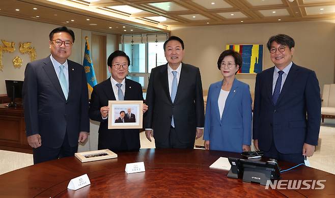[서울=뉴시스] 전신 기자 = 윤석열 대통령이 24일 서울 용산 대통령실 청사 집무실에서 박병석 국회의장에게 바이든 방한 만찬 당시 찍은 기념사진이 담긴 액자를 선물한 뒤 기념촬영을 하고 있다. 왼쪽부터 정진석 국회부의장, 박병석 국회의장, 윤석열 대통령, 김상희 국회부의장, 이춘석 국회사무총장. (대통령실통신사진기자단) 2022.05.24. photo1006@newsis.com
