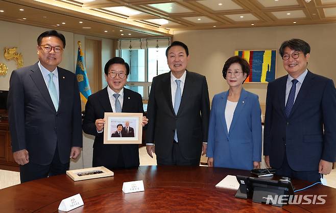 [서울=뉴시스] 전신 기자 = 윤석열 대통령이 24일 서울 용산 대통령실 청사 집무실에서 박병석 국회의장에게 바이든 방한 만찬 당시 찍은 기념사진이 담긴 액자를 선물한 뒤 기념촬영을 하고 있다. 왼쪽부터 정진석 국회부의장, 박병석 국회의장, 윤석열 대통령, 김상희 국회부의장, 이춘석 국회사무총장. (대통령실통신사진기자단) 2022.05.24. photo1006@newsis.com