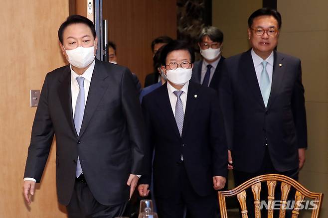 [서울=뉴시스] 전신 기자 = 윤석열 대통령이 24일 서울 용산 국방컨벤션에서 박병석 국회의장 등 국회의장단과 만찬장에 들어서고 있다. 2022.05.24. photo1006@newsis.com
