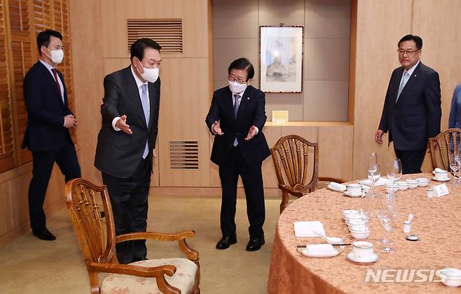 [서울=뉴시스] 전신 기자 = 윤석열 대통령이 24일 서울 용산 국방컨벤션에서 열린 국회의장단 만찬에 입장하며 박병석 국회의장에게 착석을 권하고 있다. 2022.05.24. photo1006@newsis.com