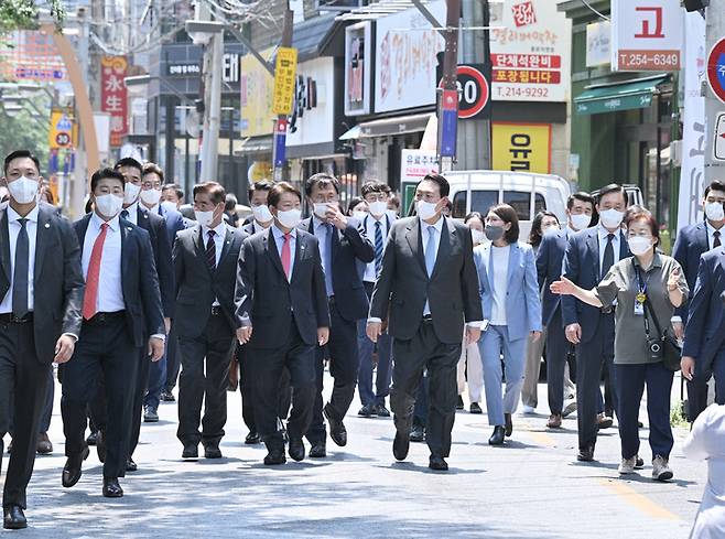 [서울=뉴시스] 윤석열 대통령이 24일 세계가스총회 개회식 참석 후 대구 근대골목을 방문하고 있다. (사진=권영진 대구시장 페이스북 캡쳐) 2022.05.24. photo@newsis.com *재판매 및 DB 금지