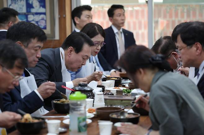 [서울=뉴시스] 윤석열 대통령이 24일 세계가스총회 개회식 참석 후 대구 근대골목 인근 식당에서 참모진과 오찬을 하고 있다. (사진=대통령실 제공) 2022.05.24. photo@newsis.com *재판매 및 DB 금지