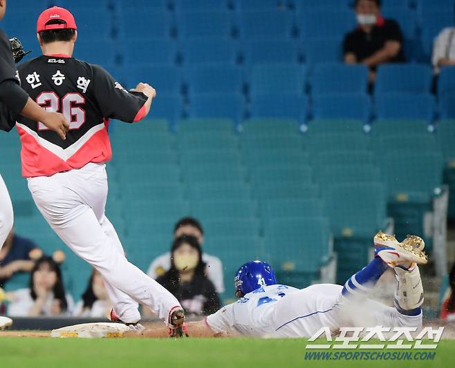 24일 대구 라이온즈파크에서 열린 KIA 타이거즈와 삼성 라이온즈 경기. 5회말 무사 김현준이 1루수앞 내야안타를 치고 헤드퍼스트 슬라이딩으로 한승혁보다 빨리 1루 베이스를 터치하고 있다. 대구=정재근 기자 cjg@sportschosun.com/2022.5.24/