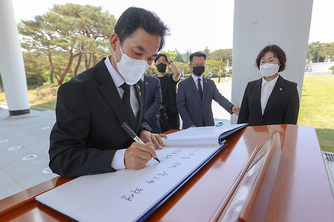 [서울=뉴시스] 조성우 기자 = 박민식 국가보훈처장이 24일 서울 동작구 국립서울현충원을 찾아 참배 후 방명록을 작성하고 있다. (사진=국가보훈처 제공) 2022.05.24. photo@newsis.com *재판매 및 DB 금지