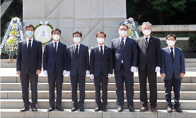 [서울=뉴시스] 조성우 기자 = 이정식 고용노동부 장관이 24일 서울 동작구 보라매공원 내 산업재해희생자위령탑을 참배한 뒤 기념촬영을 하고 있다. (사진=고용노동부 제공) 2022.05.24. photo@newsis.com *재판매 및 DB 금지