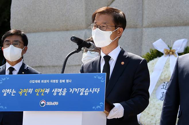 [서울=뉴시스] 조성우 기자 = 이정식 고용노동부 장관이 24일 서울 동작구 보라매공원 내 산업재해희생자위령탑 참배 행사에서 발언하고 있다. (사진=고용노동부 제공) 2022.05.24. photo@newsis.com *재판매 및 DB 금지