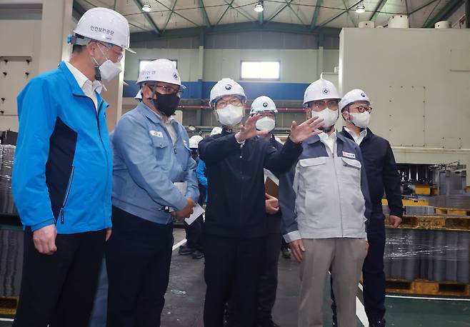 [서울=뉴시스] 조성우 기자 = 이정식 고용노동부 장관이 24일 경기도 안산시 소재 자동차 부품제조업체인 신영을 방문해 산재예방 지원사업 시행 상황을 점검하고 있다. (사진=고용노동부 제공) 2022.05.24. photo@newsis.com *재판매 및 DB 금지