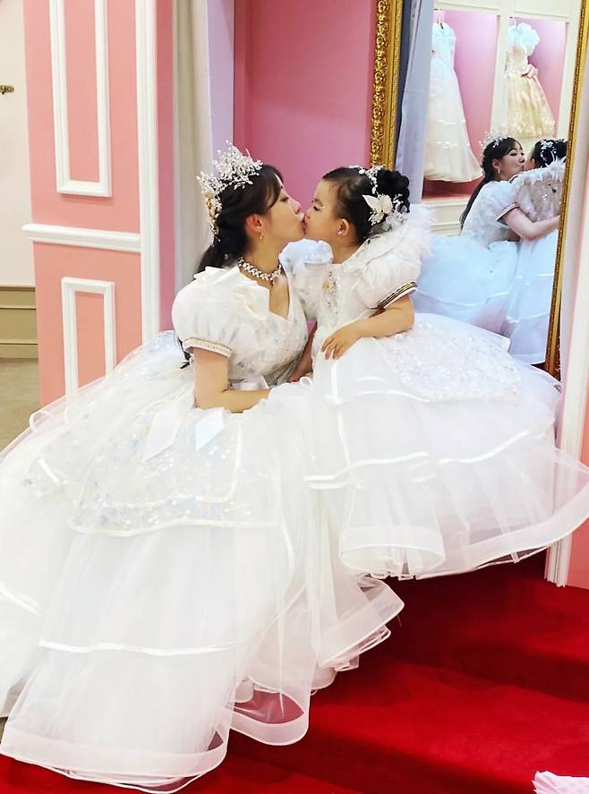 레이스가 풍성한 공주 드레스를 입은 안소미와 딸은 입맞춤까지 하며 사랑스러운 투샷을 완성했다.