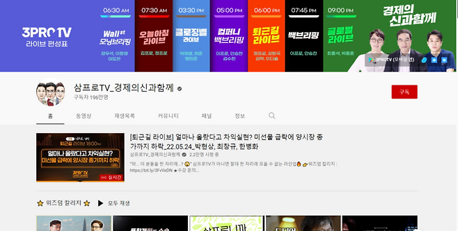 구독자 196만명(24일 기준)을 확보하고 있는 삼프로TV는 국내 대표 경제 유튜브 채널로 성장했다. 주식 투자를 하는 사람들에게 삼프로TV의 영향력은 지상파와 케이블 TV를 뛰어넘는다는 평가를 받는다. 지난해 12월 대선 특집으로 이재명 더불어민주당 후보와 윤석열 국민의힘 후보 등 대선 후보 5명을 인터뷰한 영상 콘텐츠가 누적 조회수 1000만회를 넘기며 ‘삼프로TV 현상’이라는 말이 나올 정도였다. 증권사 임원 출신 김프로(김동환), 경제 전문 기자 출신 이프로(이진우), 재미있는 입담의 방송인 정프로(정영진)가 경제 전문가를 초대해 어려운 주식·경제 이슈를 쉽고, 재미있게 진행하고 대선 후보 인터뷰를 경제 정책 분야로만 1시간 넘게 다루는 방식 등은 기존 언론사가 보여주지 못한 시도였다.