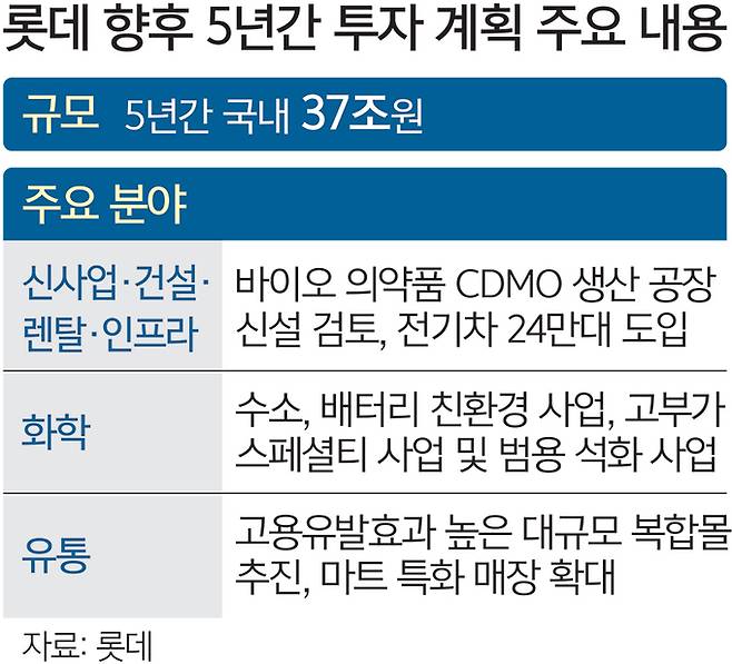 롯데는 24일 신성장 테마인 헬스 앤드 웰니스(Health&Wellness), 모빌리티(Mobility), 지속가능성(Sustainability) 부문을 포함해 화학·식품·인프라 등 핵심 산업군에 향후 5년간 37조원을 집중적으로 투자한다고 밝혔다.