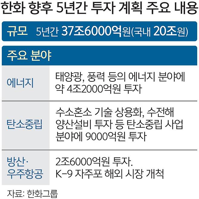 한화는 올해부터 2026년까지 5년간 총 37조6000억원의 대규모 투자를 진행한다. 이 중 20조원 규모의 국내 투자는 에너지, 탄소중립, 방산·우주항공 등 3개 분야에 집중된다.