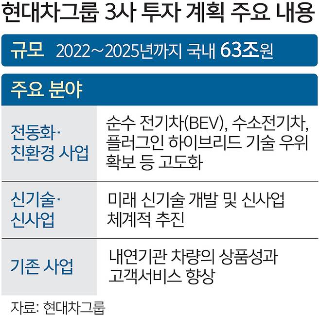 현대자동차그룹이 국내에 63조원의 대규모 투자를 단행하기로 한 것은 국내 자동차산업을 중심으로 글로벌 사업 경쟁력을 강화하기 위한 차원이다. 앞서 발표한 대미 투자액 105억달러(약 13조원)의 5배에 가까운 금액으로, 한국이 그룹의 미래 사업 중심지라는 점을 강조한 것으로 보인다.
