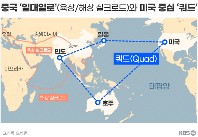 쿼드는 바이든 대통령의 순방을 계기로 공식 출범을 알린 인도 태평양 지역 경제통상협력체, IPEF(인도 태평양 경제 프레임워크)와 마찬가지로 중국을 겨냥하는 협의체로 받아들여지고 있습니다. 중국이 영향력 확대를 위해 육상과 해상에 21세기 실크로드를 건설하겠다며 추진하고 있는 일대일로 정책을 견제하는 의미도 있습니다.
