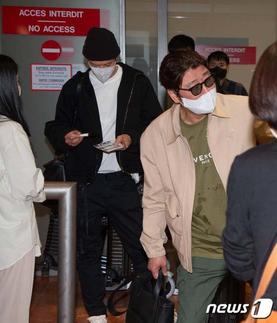 (칸=뉴스1) 이준성 프리랜서기자 = 배우 송강호와 강동원이 영화 ‘브로커’로 제75회 칸 국제영화제에 참석하기 위해 25일 0시 15분 경(현지시간) 프랑스 남부 니스 코트 다쥐르 공항에 도착, 마중 나온 팬들에게 인사하고 있다. 2022.5.25/뉴스1