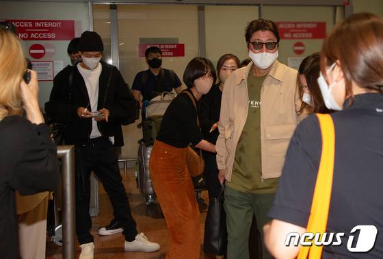(칸=뉴스1) 이준성 프리랜서기자 = 배우 송강호와 강동원이 영화 ‘브로커’로 제75회 칸 국제영화제에 참석하기 위해 25일 0시 15분 경(현지시간) 프랑스 남부 니스 코트 다쥐르 공항에 도착, 마중 나온 팬들에게 인사하고 있다. 2022.5.25/뉴스1
