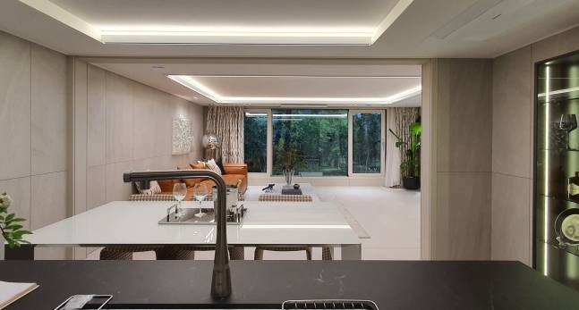 견본주택에서는 기존 30평형대의 주거 공간이 리모델링 후 40평형대로 확장된 공간을 볼 수 있습니다. 넓은 거실, 대면형 주방, 유리 난간 기능 창호, 우물천장 및 특화조명, 현관 창고와 다용도실 수납 등으로, 단순히 10평 이상의 확장감 외에도 개방감 있는 여유로운 공간에 세련된 디자인과 고급 마감이 적용된 아파트를 직접 경험하고 확인할 수 있습니다.