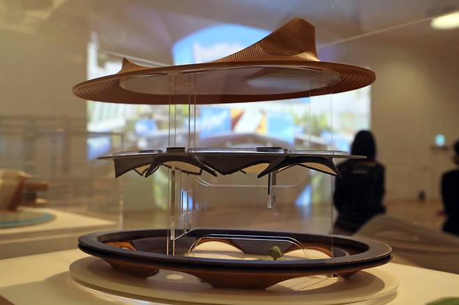 서울디자인재단과 자하 하디드 건축사무소(ZHA: Zaha Hadid Architects) 공동기획으로 준비한 기획전 '시작된 미래 Meta-Horizons: The Future Now' 개막을 앞둔 25일 서울 동대문구 DDP 디자인박물관에서 디지털 미디어, 아카이브, VR 등 자하 하디드의 미래 건축 기술을 선보이고 있다.