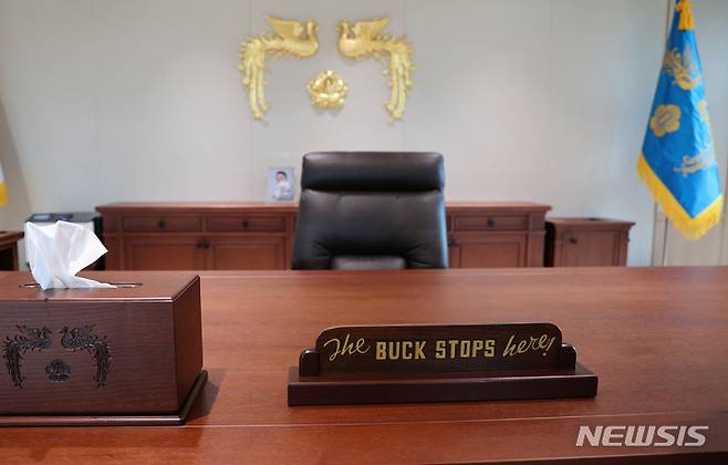 [서울=뉴시스] 전신 기자 = 25일 서울 용산 대통령실 청사 대통령 집무실 책상에 조 바이든 미국 대통령이 윤석열 대통령에게 선물한 'The Buck Stops Here'(모든 책임은 내가 진다) 문구가 적힌 탁상용 패가 놓여 있다. (대통령실통신사진기자단) 2022.05.25. photo1006@newsis.com