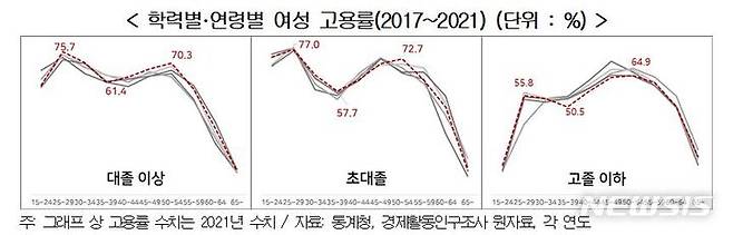 대졸 이상(대학원졸 포함) 여성의 경우, 20대 고용률은 높은 편이나 30대부터 고용률이 떨어지기 시작해 20대 고용률 수준을 다시 회복하지 못하고 그대로 하락하는 것으로 나타났다.