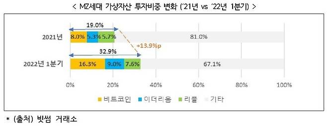 MZ세대의 1분기 투자순위는 비트코인(BTC), 이더리움(ETH), 리플(XRP) 순으로 전년도(’21년) 투자비중과 비교 시 ▲비트코인 8.0%→16.3%(+8.3%P) ▲이더리움 5.3%→9.0%(+3.7%P) ▲리플 5.7%→7.6%(1.9%P)로 증가했다. 3대 주요 가상자산에 대한 MZ세대의 총투자비중은 21년 19.0%에서 ’22년 1분기 32.9%로 13.9%P 늘어 전체 연령대 증가폭(+9.6%P) 보다 더 컸다.