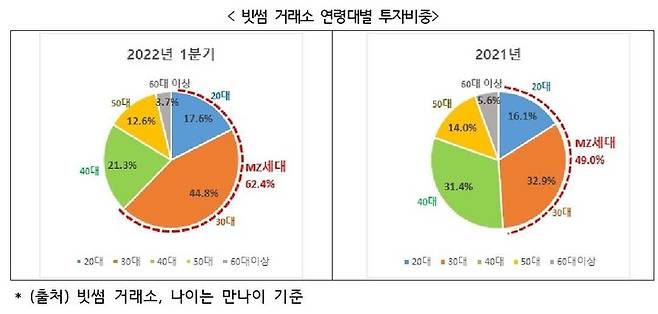 25일 국내 가상자산 거래소 빗썸에 따르면 올해 1분기 가상자산거래소 빗썸을 이용한 MZ세대(2030세대) 투자자의 투자 규모는 전체 중 62.4%에 달하는 것으로 나타났다.