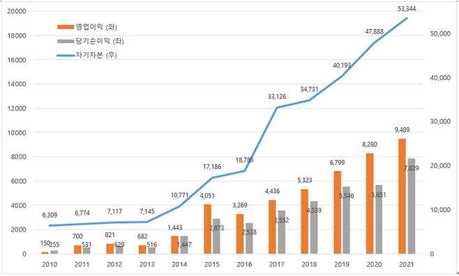 2009년 말 5295억원이었던 자기자본은 12년 동안 10배 이상 성장했습니다.