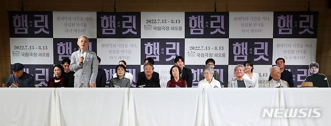 [서울=뉴시스] 박진희 기자 = 연극 '햄릿' 출연 배우들과 제작진들이 25일 서울 중구 충무아트센터에서 제작발표회를 하고 있다. 이날 발표회에는 배우 권성덕, 전무송, 박정자, 손숙, 정동환, 김성녀, 유인촌, 손봉숙, 길해연, 강필석, 박지연, 박건형, 김수현, 김명기, 이호철과 연출 손진책, 무대 디자이너 박동우, 프로듀서 박명성이 참석했다. 연극 '햄릿'은 오는 7월 13일부터 8월 13일까지 국립극장 해오름에서 공연한다. 2022.05.25. pak7130@newsis.com