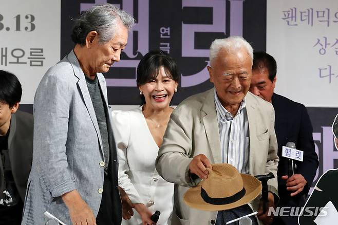 [서울=뉴시스] 박진희 기자 = 연극 '햄릿' 출연 배우 권성덕이 25일 서울 중구 충무아트센터에서 열린 제작발표회에 배우 전무송의 안내를 받으면 참석하고 있다. 연극 '햄릿'은 오는 7월 13일부터 8월 13일까지 국립극장 해오름에서 공연한다. 2022.05.25. pak7130@newsis.com