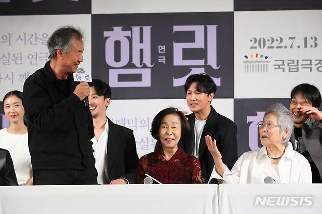 [서울=뉴시스] 박진희 기자 = 연극 '햄릿' 출연 배우 정동환, 손숙, 박정자가 25일 서울 중구 충무아트센터에서 제작발표회를 하고 있다. 연극 '햄릿'은 오는 7월 13일부터 8월 13일까지 국립극장 해오름에서 공연한다. 2022.05.25. pak7130@newsis.com