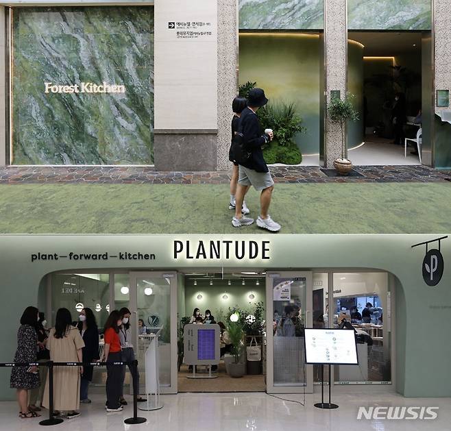 [서울=뉴시스] 권창회 기자 = 농심과 풀무원이 나란히 비건 레스토랑을 오픈했다. 가치소비 트렌드와 함께 국내에 '비건 열풍'이 불고 있는 가운데, 양사는 각기 다른 전략으로 젊은 비건층을 공략한다는 계획이다. 사진은 25일 오후 서울 송파구 롯데월드몰 내 농심의 비건 식당인 '포리스트 키친'(위)과 강남구 코엑스몰 내 풀무원의 비건 식당인 '플랜튜드'(아래) 모습. 2022.05.25. kch0523@newsis.com