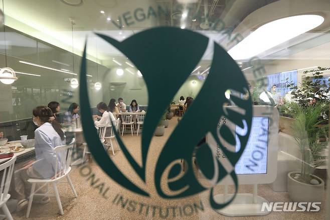 [서울=뉴시스] 권창회 기자 = 농심과 풀무원이 나란히 비건 레스토랑을 오픈했다. 가치소비 트렌드와 함께 국내에 '비건 열풍'이 불고 있는 가운데, 양사는 각기 다른 전략으로 젊은 비건층을 공략한다는 계획이다. 사진은 25일 오후 서울 강남구 코엑스몰 내 풀무원의 비건 식당인 '플랜튜드' 모습. 2022.05.25. kch0523@newsis.com