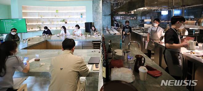 [서울=뉴시스] 권창회 기자 = 농심과 풀무원이 나란히 비건 레스토랑을 오픈했다. 가치소비 트렌드와 함께 국내에 '비건 열풍'이 불고 있는 가운데, 양사는 각기 다른 전략으로 젊은 비건층을 공략한다는 계획이다. 사진은 25일 오후 서울 송파구 롯데월드몰 내 농심의 비건 레스토랑인 '포리스트 키친' 모습. 2022.05.25. kch0523@newsis.com
