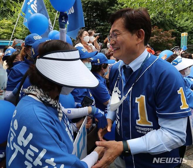 [서울=뉴시스] 국회사진기자단 = 송영길 더불어민주당 서울시장 후보가 25일 서울 성북구 길음역 앞에서 유세를 마친 후 지지자들과 인사하고 있다. 2022.05.25. photo@newsis.com