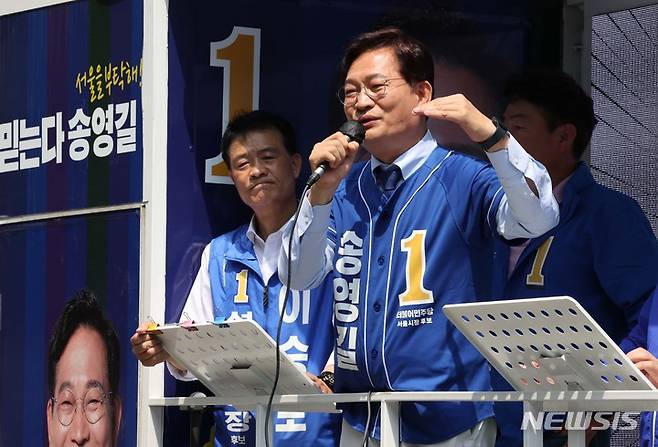 [서울=뉴시스] 국회사진기자단 = 송영길 더불어민주당 서울시장 후보가 25일 서울 성북구 길음역 앞에서 유세하고 있다. 2022.05.25. photo@newsis.com