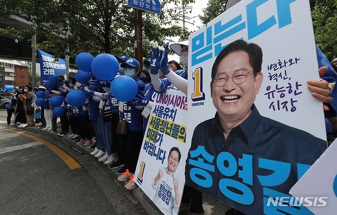 [서울=뉴시스] 국회사진기자단 = 25일 서울 성북구 길음역 앞에서 열린 송영길 더불어민주당 서울시장 후보 유세에서 선거운동원들이 선거운동을 하고 있다. 2022.05.25. photo@newsis.com