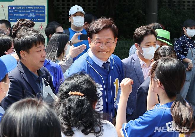 [서울=뉴시스] 국회사진기자단 = 송영길 더불어민주당 서울시장 후보가 25일 서울 성북구 길음역 앞에서 유세를 마친 후 시민들과 인사하고 있다. 2022.05.25. photo@newsis.com