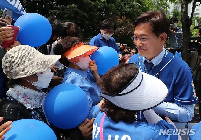 [서울=뉴시스] 국회사진기자단 = 송영길 더불어민주당 서울시장 후보가 25일 서울 성북구 길음역 앞에서 유세를 마친 후 시민들과 인사하고 있다.