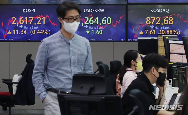 [서울=뉴시스] 김진아 기자 = 코스피가 전 거래일보다 11.35포인트(0.44%) 오른 2617.22에 장을 마감한 25일 서울 중구 하나은행 딜링룸에서 딜러들이 업무를 보고 있다. 코스닥지수는 전 거래일보다 7.62포인트(0.88%) 상승한 872.69에, 서울 외환시장에서 원·달러 환율은 전 거래일보다 1.6원 내린 1264.6원에 마감했다. 2022.05.25. bluesoda@newsis.com