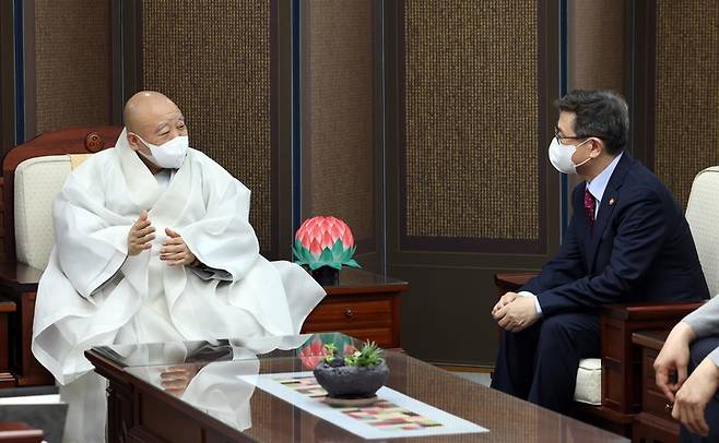 [서울=뉴시스] 박보균 문화체육관광부 장관이 25일 서울 종로구 한국불교역사문화기념관에서 조계종 총무원장 원행스님과 면담을 하고 있다. (사진=문화체육관광부 제공) 2022.05.25. photo@newsis.com *재판매 및 DB 금지